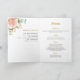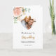 Texto de bienvenida, foto, programa, menú y una nota de agradecimiento en la parte posterior. Decorado con flores de oro rosa, rosas y vegetación eucaliptica. Es posible que tenga que ajustar el texto del menú y los nombres de la parte posterior en función del texto que necesite.