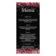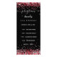 Programa de fiesta de cumpleaños y carta de menú. Personalice y agregue un nombre, edad, fecha y el menú. Un fondo negro. Decorada con confeti rojo y texto blanco.