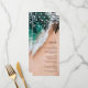 Elegante menú de destino de playa con una costa de arena tropical, olas del océano, románticas hojas de palma, luces de cuerda y una plantilla de texto que es fácil de personalizar.