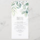Delicados arreglos de vegetación inspirados en la naturaleza, incluyendo eucaliptos de goma azul con salpicaduras de dorado y de hojas de oro junto con diseños únicos, hacen de este hotel un emocionante boda para cualquier época del año. El menú de la recepción de bodas que se muestra aquí incluye un frondoso borde de follaje en la parte superior y una suave textura acuática en la parte posterior. Agregue las selecciones de menú, las iniciales y la fecha de boda utilizando la plantilla proporcionada. Vea el vínculo de colección en esta página para ver todos los elementos coincidentes de este hermoso diseño o busque ID817 para ver otras piezas y opciones de color para este conjunto.