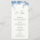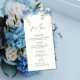 Aumente su experiencia de boda con nuestro menú Dusty Blue Floral Elegant Wedding. La carta, muy bien diseñada, ofrece una delicada disposición de flores azules polvorientas que le confieren un toque romántico y refinado a la decoración de la recepción. Los tonos azules suaves y los intrincados acentos florales le dan un aire de elegancia a cada mesa, complementando los clásicos y modernos temas bodas. El diseño está limpio y permite a los clientes leer fácilmente el menú, cuidadosamente seleccionado, desde aperitivos hasta postres. Personalice la tarjeta con sus opciones específicas de comidas para crear una adición coherente y elegante a su día de bodas. Ya sea que esté organizando una cena formal o un bufé informal, nuestro Dusty Blue Floral Elegant Wedding Menu añade sofisticación y encanto, haciendo que su comida boda sea visualmente agradable como deliciosa.