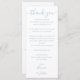 Un elegante boda azul polvoriento celebración gracias tarjeta de recepción, personalizada con su especial mensaje de agradecimiento conjunto en tipografía elegante y programa de eventos y fiesta de boda al revés. Un agradecimiento especial por sus invitados. Diseñado por Thisisnotme©