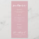 Este polvoriento menú de cena rosa boda rosa presenta una delicada tipografía blanca para una romántica ceremonia vespertina de novia a la que le gustan los colores suaves y el mínimo diseño de escritura. Carta rosa pastel suave.