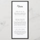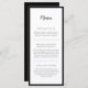 Modern Elegance Menú Boda en blanco y negro que incluye los nombres de las parejas en una hermosa caligrafía y la fecha en una fuente tradicional serif por un lado. En el reverso se encuentra el menú de la recepción, rodeado por un mínimo borde negro. Personalice la descripción de su menú de la recepción de bodas para que sus huéspedes se sientan tentados con la comida que se viene. Este diseño está disponible en una variedad de formatos y productos de eventos bodas.
