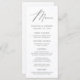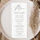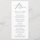 Menú de boda simple y elegante que presenta "Menú" en una escritura negra moderna sobre un fondo blanco con sutiles manchas negras. Personalice el menú de la boda agregando sus nombres, fecha de la boda e información del menú. Diseñado para coordinar con nuestra colección de bodas Elegancia Moderna.