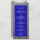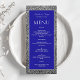 Añade un toque de lujo a tu recepción con este elegante menú boda de color azul real y plata purpurina. Diseñado con una tipografía moderna limpia y acentos plateados brillantes, el hotel exuda sofisticación y estilo. Perfecto para bodas de invierno o celebraciones formales por la noche, este menú se completa con el marco de su elegante mesa mientras guía a los huéspedes por su cuidada cocina.