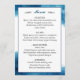Carta moderna y elegante con un bonito diseño acuático en tonos azules. En la parte posterior del menú se muestra el nombre de la pareja boda o el nombre del evento, y la fecha. ¡Hermoso año para cualquier tipo de boda, formal a rústico! Diseño ©Rosalind Moore, Diseño de las Lanes de Cerezo.