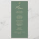 Elegante menú verde y Minimalista dorado Boda Carta elegante y elegante boda de moda dorada y verde. En él se exponen obras de arte lineal rústico eucalipto hoja de oro y fondo de boho verde salado esmeralda con nombres de marido y mujer y fecha. En tipografía de escritura dorada. Personalizar pulsando sobre el botón PERSONALIZAR.