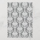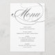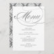Las elegantes y formales tarjetas de menú de cena de boda blanco presentan un guión de caligrafía gris de carbón oscuro y un patrón de damasco en la parte posterior de la tarjeta.