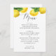 Añada un toque fresco de encanto mediterráneo a sus mesas de recepción con esta carta de boda limón, muy bien diseñada con cítricos acuarelas y vegetación exuberante. El elegante borde de la fruta dorada aporta un vibrante look inspirado en el huerto que se combina a la perfección con bodas rústicas, costeras, de viñedos o de jardín de verano. La combinación de texto serif moderno y la caligrafía del guión fluido hace que sea elegante y versátil. Ideal para parejas que planean una celebración con temática cítrica, boda de destino inspirada en la costa de Amalfi, recepción rústica de viñedos o elegante ceremonia costera.