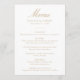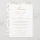 Aumente su recepción nupcial con nuestro elegante menú de bodas florales Chinoiserie Gold. Diseñado con una elegante caligrafía dorada sobre un fondo blanco limpio, este menú es totalmente personalizable con sus nombres, fecha boda y detalles del menú. El reverso presenta un magnífico patrón floral de Chinoiserie dorado y blanco, que le da un toque de elegancia clásica a su decoración de mesa. Una manera perfecta de complementar su día especial con un estilo y una sofisticación personalizados.