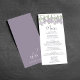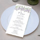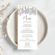Este diseño cuenta con una tarjeta de menú boda con un elegante guión caligráfico, con un diseño floral clásico de lavanda de lilac y un curso de cena clásico