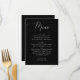 Este elegante menú de bodas cuenta con un sofisticado fondo negro con un delicado guión y tipografías séricas intemporales. Está diseñado para guiar a los huéspedes durante la cena y ofrece platos con un formato claro y elegante. Perfecto para bodas minimalistas formales, de corbata negra o modernos. Este menú impreso le da un toque refinado y pulido a su taberna de recepción. Personalizable completo para coincidir con tu menú y estilo único.