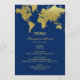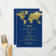 Las elegantes cartas de menú boda inspiradas en los viajes vintage presentan un diseño de borde de mapas del mundo. Color azul marino y Relieve metalizado falso dorado.