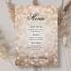 ¡Hay productos a tu disposición! Esta elegante tarjeta "Menu" de boda presenta un diseño moderno de luces de bokeh, nombres personalizados y texto de fecha. Es totalmente personalizable y fácil de usar y personalizar.