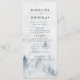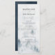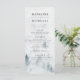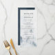 Elegante carta de menú de bodas personalizada que incluye un bosque de pinos de color gris y azul polvoriento en la parte superior con su nombre, fecha boda y detalles del menú que se muestran a continuación. El menú cambia a un fondo de color azul marino con espacio para texto y fotos. Diseñado para coordinar con nuestra elegante colección de bodas del bosque de invierno.