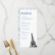 Bañera de tela francesa Mitzvah Eiffel Menú elegante para la cena en recepción con la opción de personalizar total de todos los títulos y textos. La parte delantera es en blanco y negro con una foto de la Torre Eiffel y la parte trasera tiene un diseño floral francés azul denso y un nombre personalizado y un texto de evento. Introduzca la Herramienta de diseño de Zazzle para un diseño adicional.