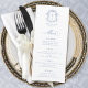 Esta elegante tarjeta de menú Escudo barroco monograma azul Boda cuenta con un escudo de estilo barroco vintage monograma y una caligrafía elegante.