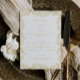 Elegante flor silvestre, dorado floral y blanco de 5x7" Boda Carta de menú de la cena plana en caligrafía de escritura moderna. Puede encontrar una colección de artículos coincidentes y tamaño 4x9" en nuestra tienda VelvetPaperCo.