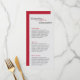 Impresiona a tus huéspedes con nuestro "Elegante menú Minimalista con el Boda de acentos rojos". Este diseño elegante y sencillo presenta los nombres de la pareja en un tipo de letra de máquina de escribir clásico en negro, unido por un elegante símbolo rojo "y". Los detalles del menú se presentan en una fuente clara de tapas negras, con las rúbricas de las comidas resaltadas en rojo para lograr un efecto llamativo en el fondo gris claro. En la parte trasera del menú se mantiene el tema elegante con un fondo rojo intenso, mostrando los nombres de la pareja y el elegante símbolo "y" en un marco sofisticado. Ideal para añadir moda y un toque minimalista a su boda.