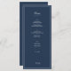 Antecedentes náuticos azules para un diseño simple pero elegante basado en la tipografía. Pie de monograma de la pareja. Blanco sobre azul marino oscuro. Vuelve al color azul sólido. La tarjeta de menú tiene tipos de letra francos y sans serif con un realce de línea única bajo "Menú". Un aspecto muy náutico tanto en color como en tipografía.