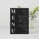 Este menú de cena de boda elegante y sofisticado presenta un fondo negro sólido con texto de color blanco. La palabra "MENU" se imprime en un diseño vertical a lo largo de la parte izquierda en una fuente blanca grande y negrita, con los elementos del menú impresos a la derecha. Puede personalizar las opciones para incluir sus propias opciones de menú personalizadas para su boda u otro evento especial.