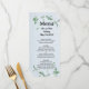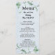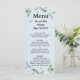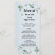 El menú boda, con un precioso fondo, incluye una delicada rama de hojas y una hermosa caligrafía para los nombres de la pareja. Ambos elementos le dan un toque de elegancia, contribuyendo así al ambiente acogedor. Los menús se presentan con esmero, lo que refleja la atención de la pareja por los detalles.
