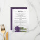 Este bonito menú boda presenta un diseño sencillo y elegante, con un título de caligrafía de guión y un único rosa ametista violeta de tallo largo sobre su lado, reflejado en un estanque de agua.
