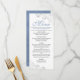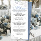 Este bonito menú le dará un toque de elegancia a la recepción de bodas. Cuenta con un bonito diseño con adornos de Relieve metalizado gris plateado y remolinos sobre un fondo blanco clásico, con un texto azul polvoriento y una espalda azul polvorienta. Hay espacio para los nombres de la pareja y la fecha del boda, y el texto es completamente personalizable. Elegante, elegante y con mucho brillo, este menú le dará un toque de elegancia y gracia a su celebración.