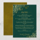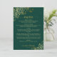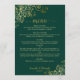 Este bonito menú boda es sencillo, elegante, sofisticado y elegante. Presenta un elegante diseño verde esmeralda con caligrafía de escritura dorada de encaje y delicados rizos dorados y remolinos en las esquinas. El dorso es un bonito color dorado de mármol.