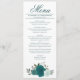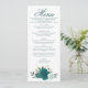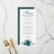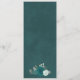 Este bonito menú le dará un toque de elegancia a la recepción de bodas. Tiene un bonito diseño floral de moda boho con un conjunto de rosas acuáticos pintados a mano en tonos verde azulados, turquesa, aqua y cian, además de brotes de hojas de eucalipto y de vegetación. Hay espacio para los nombres de la pareja y la fecha del boda, y el texto es completamente personalizable.