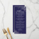 Este bonito menú le dará un toque de elegancia a la recepción de bodas. Cuenta con un bonito diseño con unos adornados rizos de Relieve metalizado gris plateado y remolinos sobre un fondo azul marino. Hay espacio para los nombres de la pareja y la fecha del boda, y el texto es completamente personalizable. Elegante, elegante y con mucho brillo, este menú le dará un toque de elegancia y gracia a su celebración.