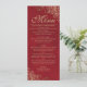Este bonito menú le dará un toque de elegancia a la recepción de bodas. Presenta un bonito diseño con adornos de Relieve metalizado dorado y rizos en un fondo de color rojo carnoso y mármol. Hay espacio para los nombres de la pareja y la fecha del boda, y el texto es completamente personalizable. Clásico, elegante y con mucho brillo, este menú le dará un toque elegante a la recepción de bodas.