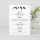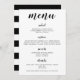 Un menú sencillo y elegante con una franja blanca y negra en la parte trasera y un texto sencillo y de diseño en la parte delantera. Este menú se puede usar por su cuenta o como complemento de nuestra suite invitaciones a la boda blanca y negra. Véalo en la Tienda de Zazzle Scriptiva - www.zazzle.com/scriptiva