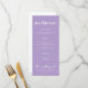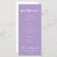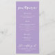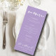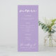 Este encantador menú de boda lilac propone una hermosa tipografía blanca sobre un suave fondo violeta para una ceremonia de primavera por la tarde. La decoración en tonos pastel de lavanda es una delicada elección de colores para una elegante ocasión en el jardín.
