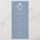Un menú elegante con un aire vintage, recomendado para un boda de color boda azul polvoriento. Encima del texto, hay un monograma en un escudo de Relieve metalizado falso de plata. El título "Menú" y los subtítulos están escritos en mayúsculas. Todo el texto puede ser personalizado y tiene un color gris similar al escudo falso plateado. El fondo es azul polvoriento. En la parte trasera hay el mismo monograma en escudo. El monograma está formado por las dos iniciales separadas por una línea delgada. El escudo floral vintage proviene de una antigua portada de libros, de "Rust, Smut Mildew & Mold", de 1870, ahora de dominio público.