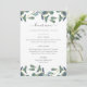 La carta boda, sencilla y de moda, incluye hojas de eucaliptos de color verde en un fondo blanco y limpio con un guión moderno escrito a mano.