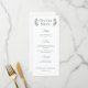 Un sencillo y elegante guión de caligrafía verde con dos hojas de eucalipto de acuarela a ambos lados en la parte superior alrededor del título del menú de la cena. Una bonita carta minimalista de bodas con una detallada carta de entrantes, platos principales y postres. Moda, decoración moderna de boda por la noche para una ocasión en el jardín por la noche.