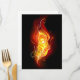 Una brillante pluma de pavo real hecha de fuego y llama sobre fondo negro.