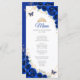 Carta de menú delgada de la celebración de Quinceanera azul real, dorada y blanca. Características, letra de guión, mariposas doradas, rosas de acuarela y tiara. Perfecto para una elegante celebración de glam al estilo de la princesa. Personaliza con tus propios detalles.