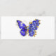 Joyería, azul, zafiro, mariposa floral brillante con ala decorada con flores azules y preciosas con hojas de oro sobre fondo blanco.