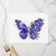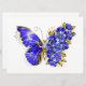 Joyería, azul, zafiro, mariposa floral brillante con ala decorada con flores azules y preciosas con hojas de oro sobre fondo blanco.