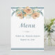 acuarela Boda de verano floral Tarjeta de menú verde azul diseñada con un grupo de flores de verano en tonos suaves de taupe, con un borde verde azul sobre un fondo blanco. El texto incluye los nombres de la novia y de Groom y la fecha de Boda. En el reverso se incluyen las selecciones de menú Aperitivo, Entre y postre, en un fondo verde azul, con texto blanco. Para personalizar, simplemente inserte sus detalles en nuestra plantilla sencilla, reemplazando el texto de ejemplo.
