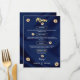Tarjeta de menú con Boda floral de marfil beige azul y dorado de la Marina Regal. Trae un toque de elegancia intemporal a tu recepción con esta lujosa carta boda azul marino. Diseñado con una textura rica y seda y acentos de Relieve metalizado dorado brillantes, combina sin esfuerzo la sofisticación con el romance. Los detalles florales de color champagne y marfil beige suavizan los tonos profundos, creando una estética majestuosa y atractiva que realza tu escapada. A diferencia de las tarjetas de menú básicas, este diseño de alta calidad eleva cada detalle, asegurando a sus huéspedes la experiencia visual y culinaria. Imprimido en material de cartón de gama alta con fuentes y diseños completamente personalizables, complementa bodas clásicos, modernos e inspirados en flores. Tanto si se combina con la elegancia a la luz de las velas como con el encanto contemporáneo, esta carta transforma su fiesta boda en un marco refinado. Porque un menú muy bien elaborado prepara el escenario para una experiencia gastronómica inolvidable.
