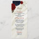 bellas flores azul marino y rojo con hojas doradas de bronce sobre el fondo del menú boda botánico de mármol. Los detalles del purpurina se simulan