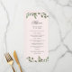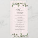 Esta carta boda de moda tiene unos bordes altos e inferiores de abundantes hojas de color verde acuático y unas pequeñas bayas sobre un suave fondo rosa. La caligrafía moderna dice "Menú". La elección perfecta para su elegante y minimalista recepción nupcial.