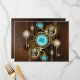Lentes turquesa con un reloj de antigüedades con engranajes de latón y llaves doradas sobre un fondo oxidado y marrón. Estilo Steampunk.
