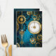 fondo turquesa, texturado, de vapor punk con bronce y oro, llave de plata y reloj. Estilo Steampunk.