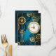 fondo turquesa, texturado, de vapor punk con bronce y oro, llave de plata y reloj. Estilo Steampunk.