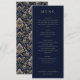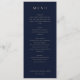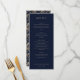 Este elegante menú de boda presenta un sofisticado fondo azul marino profundo con texto blanco crujiente, creando una atmósfera refinada y formal. La disposición es limpia y estructurada, con secciones para entrantes, ensalada, plato principal y postre, cada una resaltada en una fuente serif en cursiva. Los marcadores personalizables en la parte inferior permiten la personalización, lo que lo hace perfecto para ocasiones especiales como bodas. El diseño minimalista enfatiza la simplicidad y la elegancia, ideal para parejas que buscan un look clásico pero moderno para su evento.